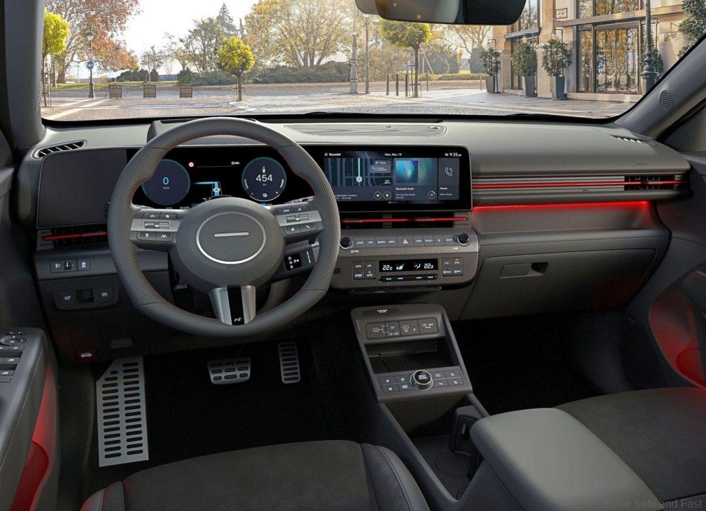 Step inside the cabin, and the Kona Electric N Line offers a captivating driving environment. The sport seats, adorned with the N Line logo and highlighted by red contrast stitching, add a touch of dynamism to the interior. The steering wheel and dashboard feature additional red details, contributing to the N Line’s unique and immersive aesthetics. The focus remains on delivering a thrilling driving experience without compromising on comfort and functionality.