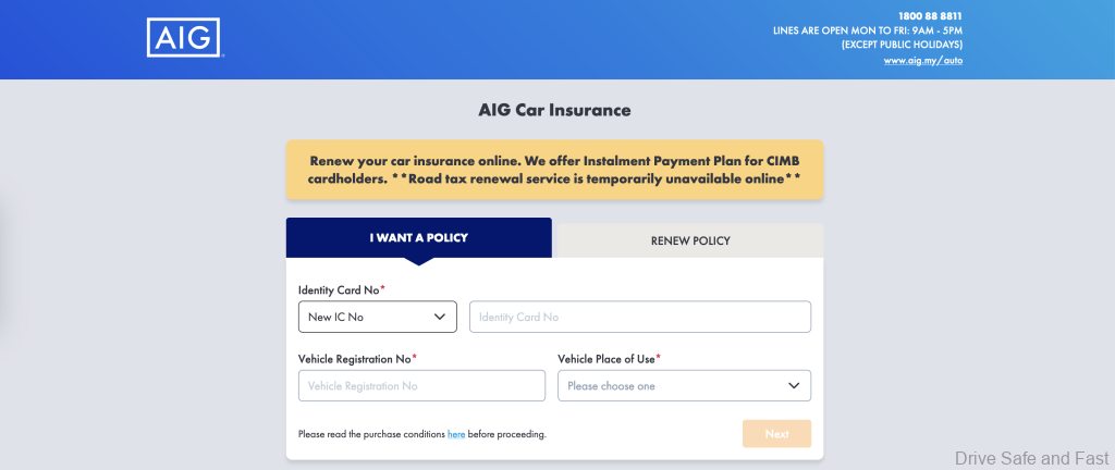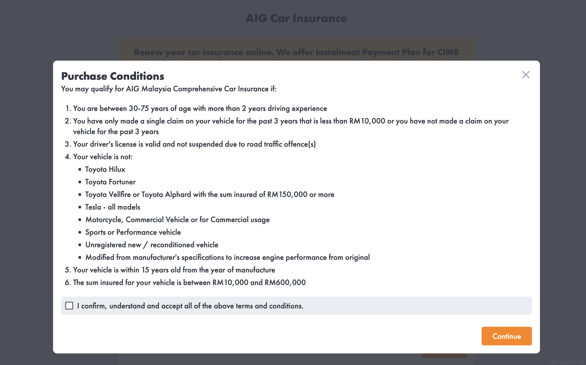 Here’s what the “purchase conditions” for a new comprehensive motor insurance policy with AIG Malaysia are: