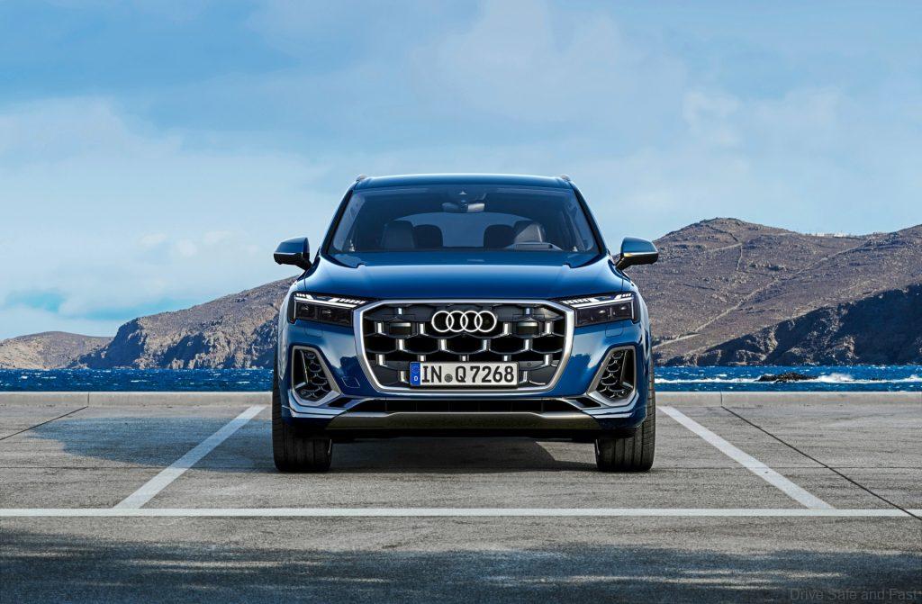The 2024 upgrade presents a robust and elegant design for the Q7. The exterior boasts minimalist forms, clean surfaces, and distinctive color options. The Audi Singleframe with vertical inlays and the higher-positioned headlights create a powerful and present front-end architecture. The vehicle’s self-confident appearance is further emphasized by color-framed air intakes, contributing to a robust off-road look.