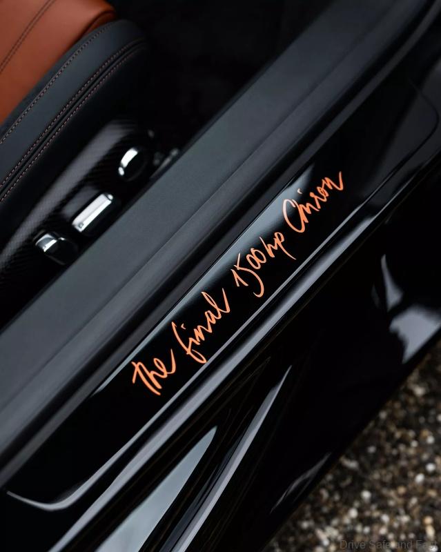 The Bugatti Chiron, finished in glossy Nocturne black paint with Copper orange accents, features a unique horseshoe grille showcasing the number ‘16’ in the same copper hue. The interior is adorned with Beluga Black and Copper leather, with a handwritten note on the center console and door sills declaring it as “The final 1500hp Chiron.”