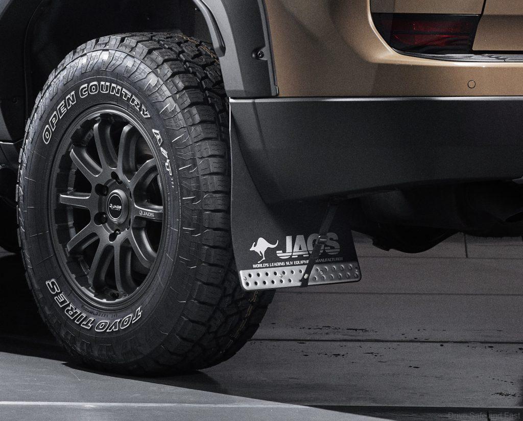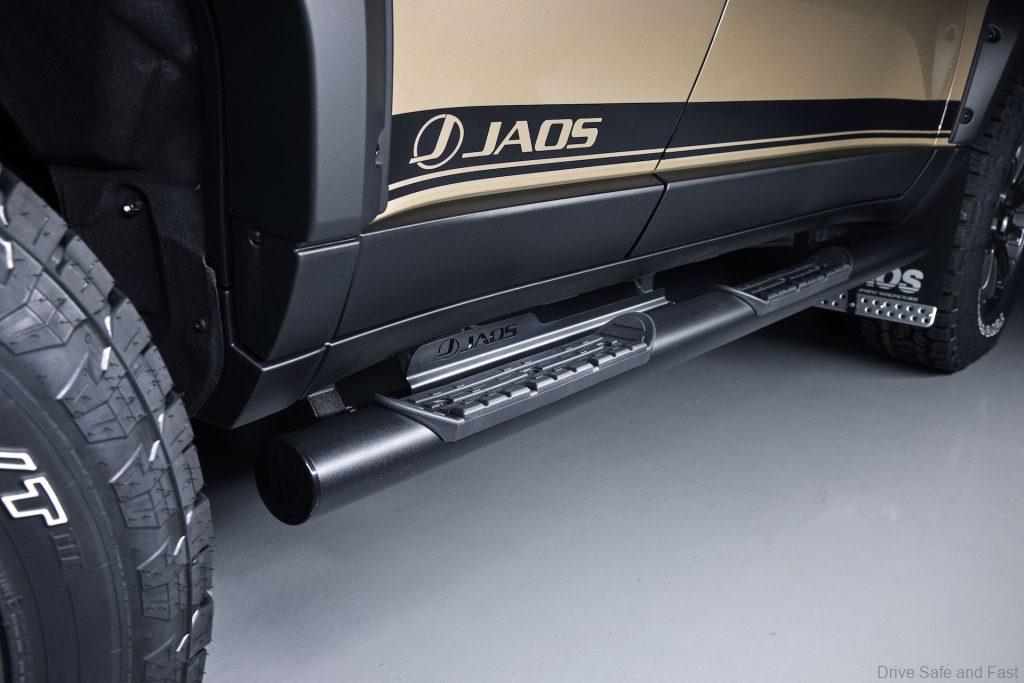 The customization specifications include JAOS Front Bumper Guard, Skid Plate Type R, Fender Garnish Type X, Side Step Black, Flat Rack for Roof Rail, Mud Guard III Black, TRIBE CROSS Wheels, BATTLEZ Lift Kit, and TOYO TIRES OPEN COUNTRY A/T III.