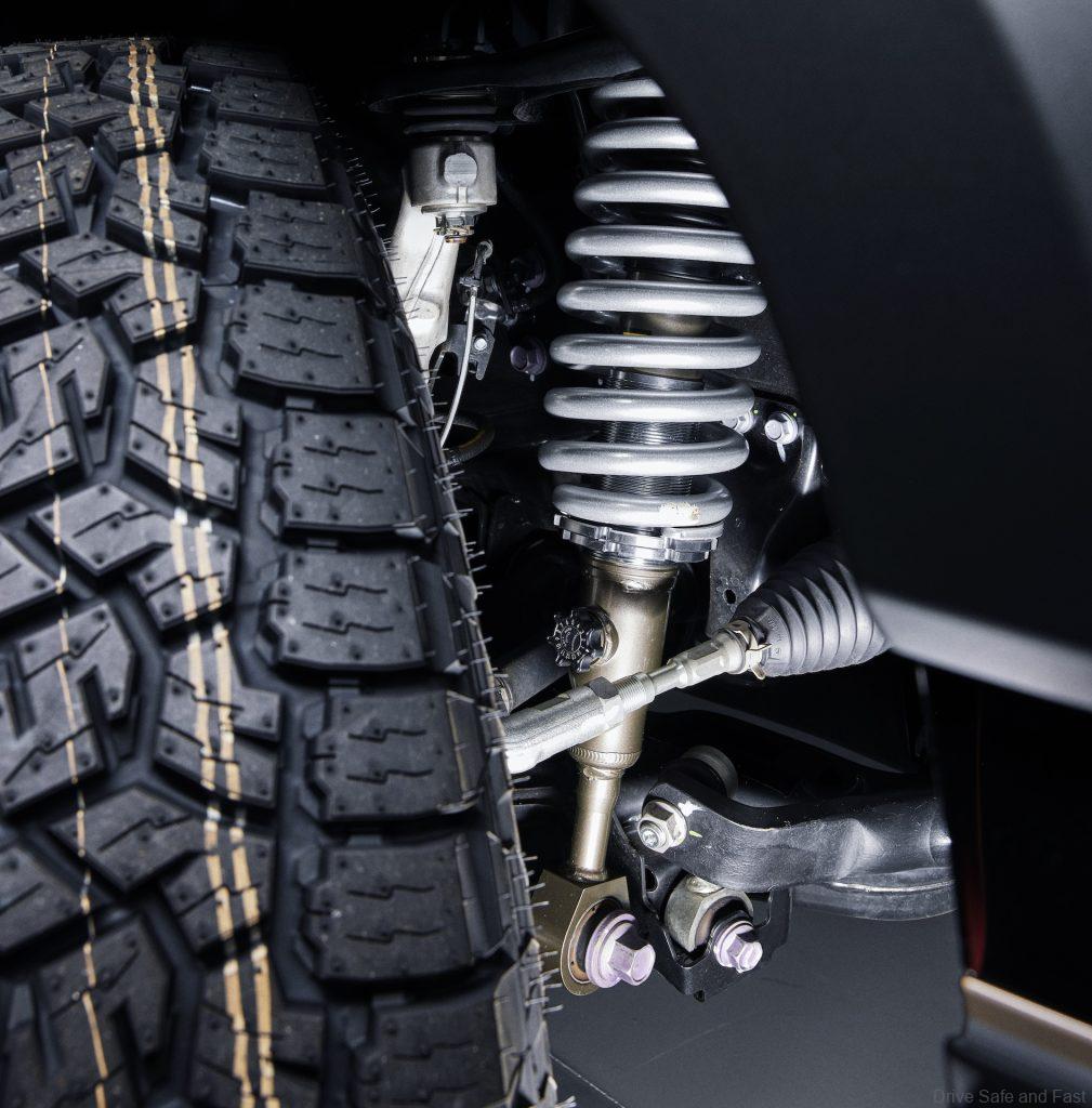 The vehicle’s front boasts a rugged bumper, a hallmark of heavy-duty off-road vehicles, crafted from lightweight and highly rigid ABS resin. Essential off-road components such as fender garnishes, tube-style side steps, large mudguards, and aluminum skid plates ensure optimal protection during off-road escapades.