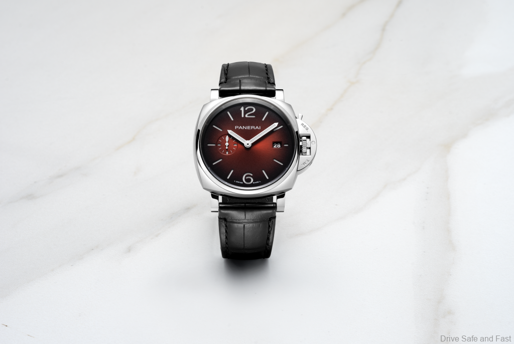 Crafted with precision, the Luminor Due PAM01424 boasts a 42mm steel case that exudes understated refinement. Its burgundy shaded dial, a fitting tribute to Valentine’s Day, transitions seamlessly from a lighter center to a darker gradient at the edges, creating a captivating visual allure. The sandwich dial showcases the date at 3 o’clock and a small second hand at 9 o’clock, adorned with white Super-Luminova® that emits a mesmerizing green glow in low light conditions.