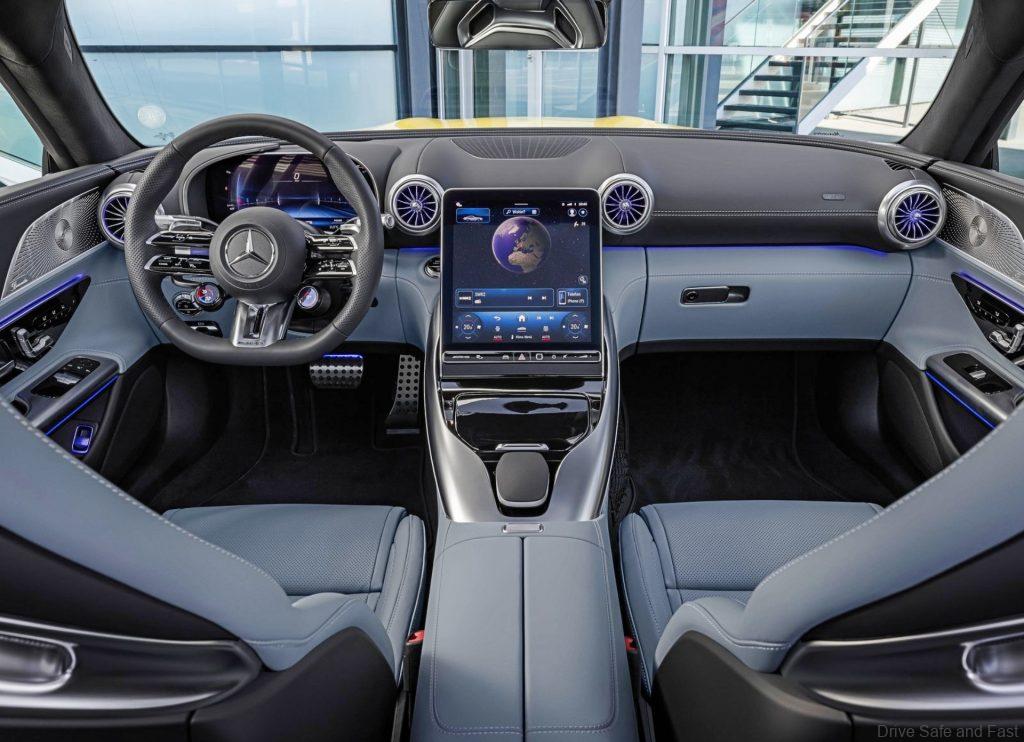 The interior features a ‘hyper-analogue’ cockpit design with a fully digital instrument cluster in a 3D visor, an 11.9″ infotainment system in portrait format and the latest MBUX system with AMG-specific content. AMG sports seats in Nappa leather are standard with electrical and manual adjustment. AMG performance seats are optional.