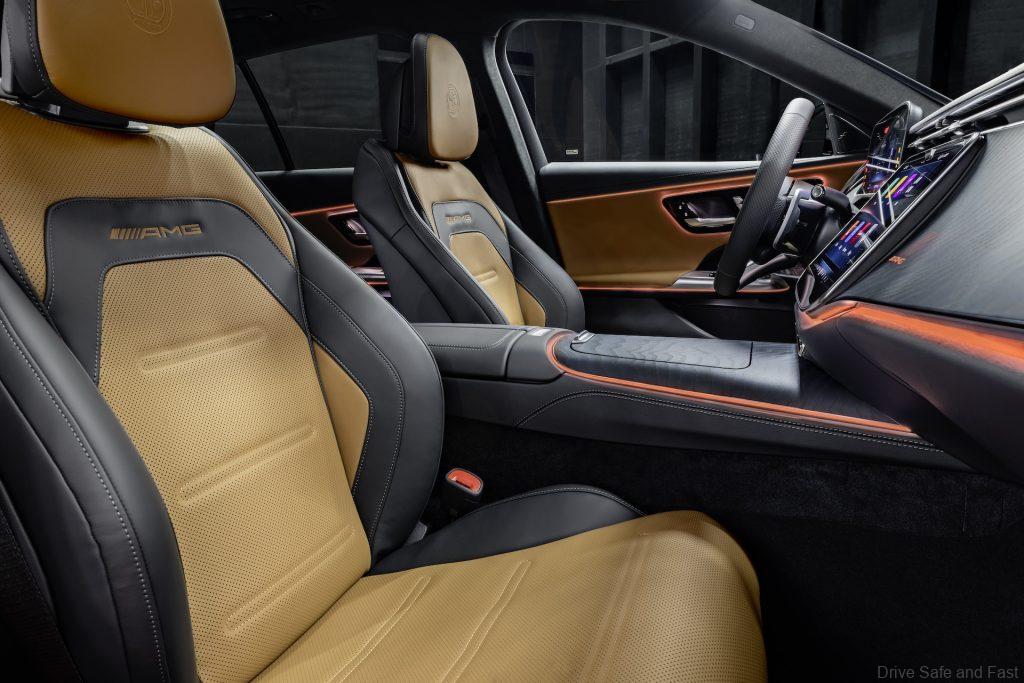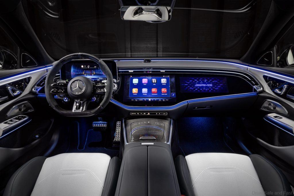 The new Mercedes-AMG E53 Hybrid 4MATIC+ gets special design elements such as AMG-specific radiator elements, wider front fenders, reshaped outer air inlets with two vertical fins, a central A-wing, independent front AMG apron, a large central lower inlet, and an external opening on the wheel arch. There are also AMG-specific side skirt panels, light alloy wheels (19″ standard, up to 21″ available), an AMG spoiler lip on the trunk lid and and an AMG rear apron with diffuser and two round double tailpipes. There are also hybrid-specific badges.