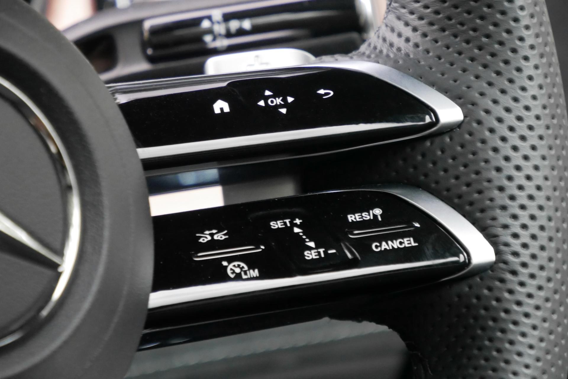 The interior is a nice mix of luxury and practicality with a tech focus. On a positive note, the large displays are fluid and crystal clear, there are lots of storage spaces, a wireless phone charger, and AMG Line design touches. On the negative side, touch-capacitive controls on the steering sometimes register misclicks. Physical buttons from older Benz steering wheels are functionally superior and don’t show smudges as easily as this.