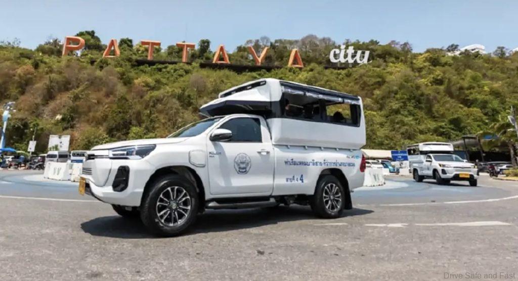 A motorcade of the battery electric Hilux Revo pickup trucks paraded through the seaside resort city of Pattaya, located about 100 km east of Bangkok. These electric trucks have been re-purposed for fixed bus route service in the tourist hotspot.