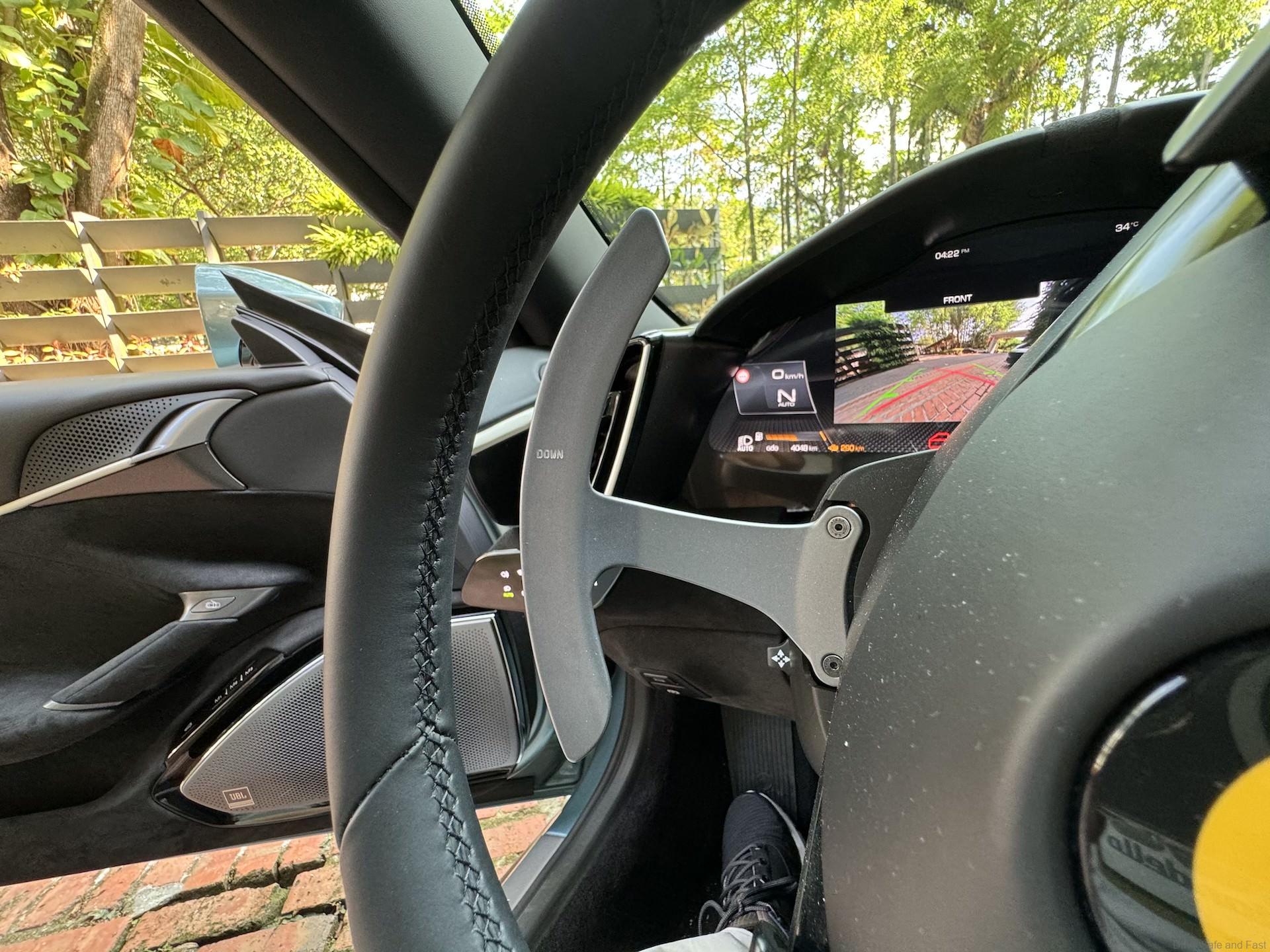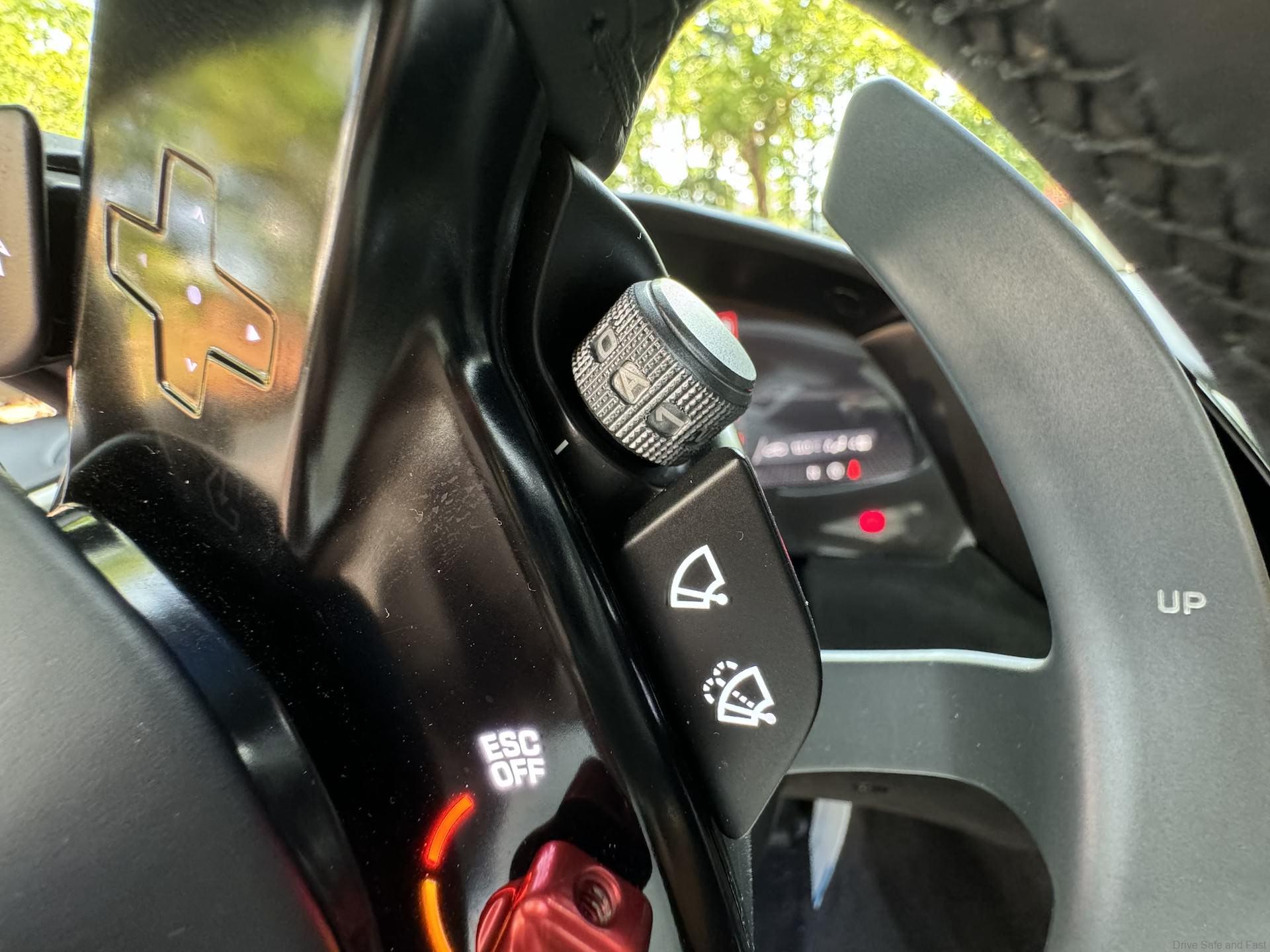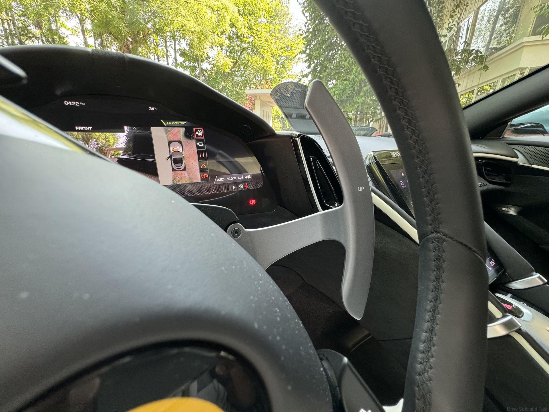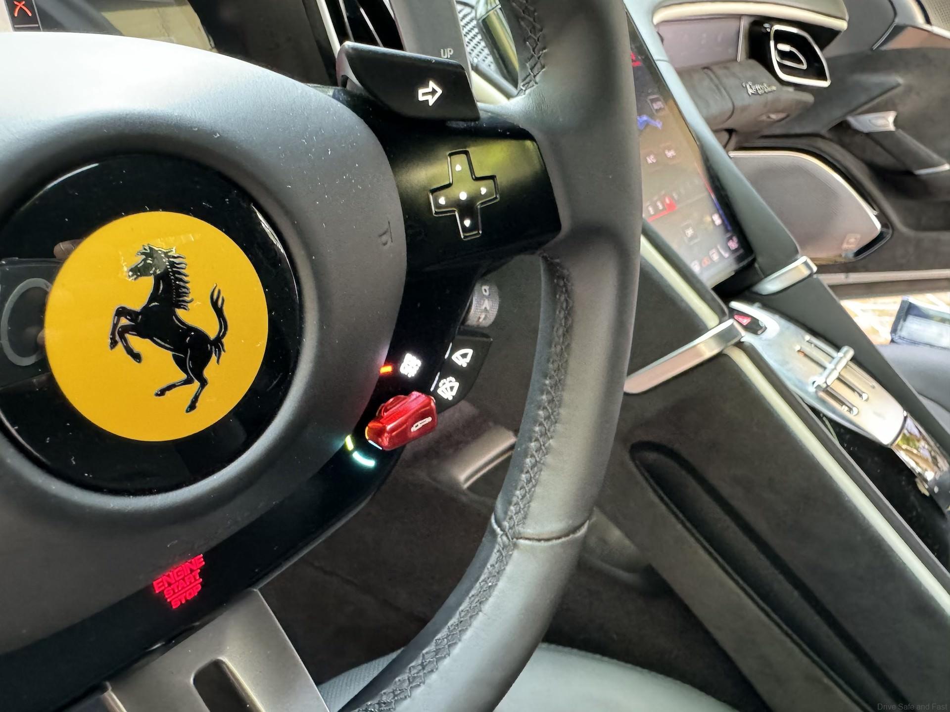The ignition is a just below the Ferrari logo on the steering wheel. Yes, its ON the steering wheel. On the bottom right of the steering wheel is the all important ‘Manettino’ switch in bright RED colour. It has five ‘DRIVE’ positions to make its handling and traction performance even more accessible with the introduction of the RACE position. Supported by the introduction of the Ferrari Dynamic Enhancer, it is designed to boost your driving enjoyment and extract the most from this Italian supercar. This feature you need time to learn and understand to get the most from your V8 engine and 8 -peed gearbox.