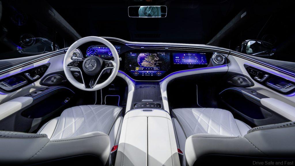 A change also comes to the exterior look. The black panel has been given a distinguished look to set the EQS apart from its siblings. Now there’s a chrome application as part of the Electric Art Line. There are also chrome-plated and flush-mounted slats on the front grille cover and to top it all off, a traditional upright three-pointed star hood ornament gives the EQS a true flagship Mercedes finish.