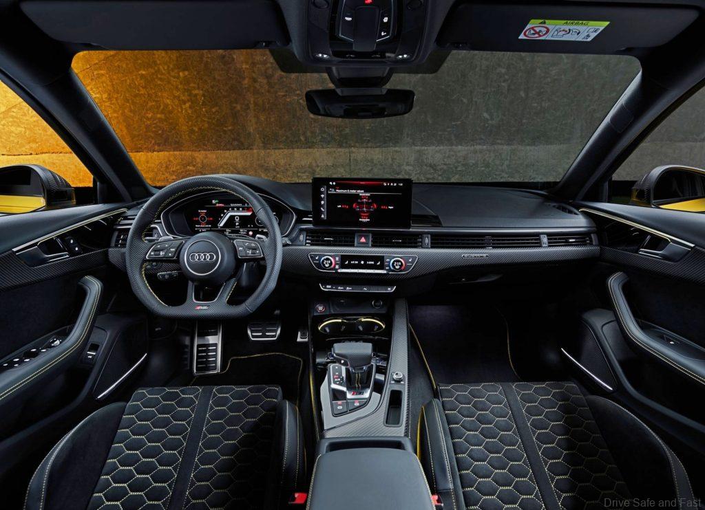 Paying homage to the iconic Imola Yellow color of the 2001 RS4 Sport, the edition 25 years boasts a striking exterior design that commands attention. Black trim accents, tinted sun protection glazing, and glossy black Audi rings add to the aggressive yet elegant aesthetic. Step inside, and you’ll be greeted by an interior that exudes sportiness, with yellow contrast stitching, Alcantara accents, and RS bucket seats with honeycomb stitching.