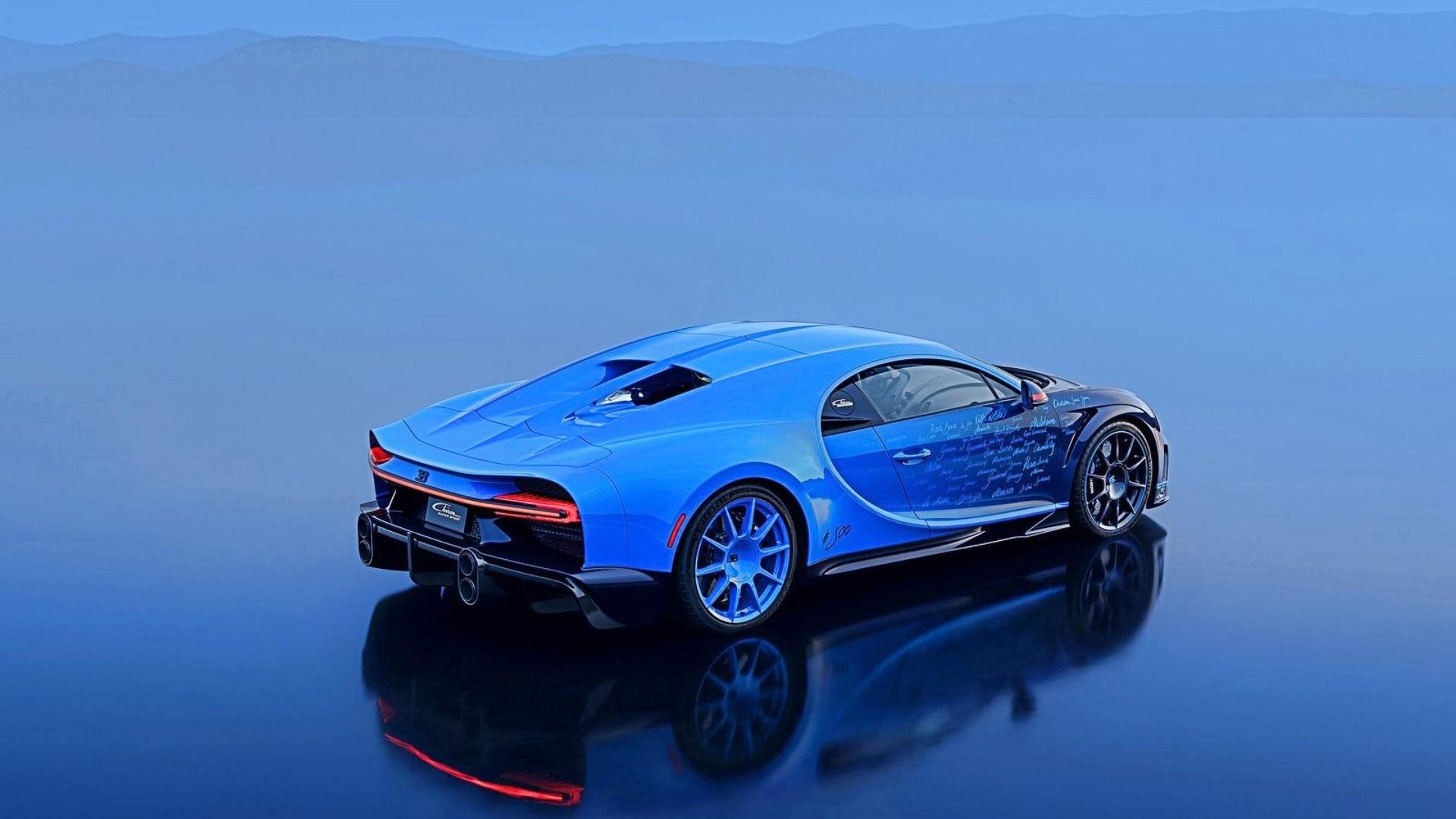Accentuating the visuals are colored wheels that mirror the front and rear shades, a bespoke ‘bullet speed’ inspired design signifying the Chiron’s blur of motion at over 300 mph, and a special blue Bugatti ‘macaron’ grille emblem.