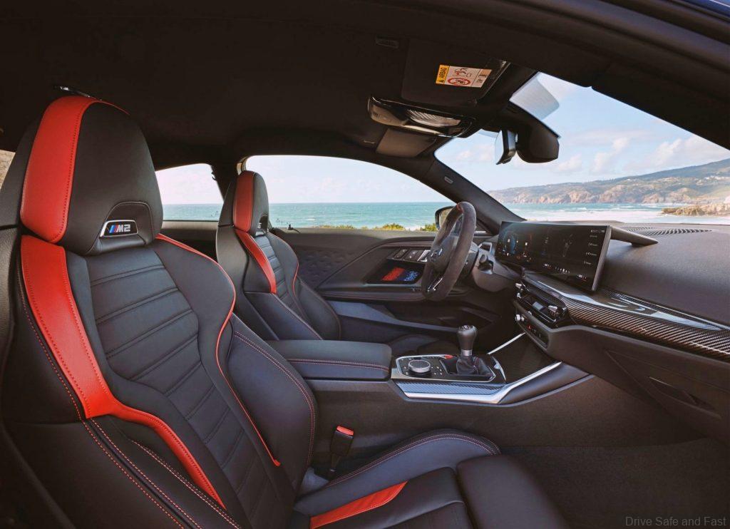 The interior of the new 2 Series Coupé has been enhanced to deliver a more premium and sportier ambiance. Standard heated sports seats with M Performtex black upholstery combine a sporty design with sustainability. Optional perforated Sensatec upholstery is now available in black, cognac, and the new Tacora Red with decorative quilting, while a new black Vernasca leather with red accents is also on offer.