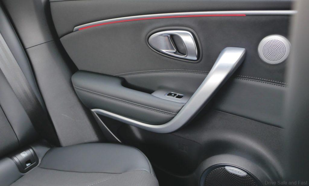 The interior build quality is really excellent and material choice is also top notch. You get nice Alcantara and leather as the primary upholstery and these materials can be found on the dashboard and both front and rear door cards. The most offensive and scratchy plastic pieces are hidden away below the centre console where you’ll find slightly out-of-place twin USB Type-A ports. There’s a USB Type-C port for the rear passengers though. Ambient lighting is featured as well.