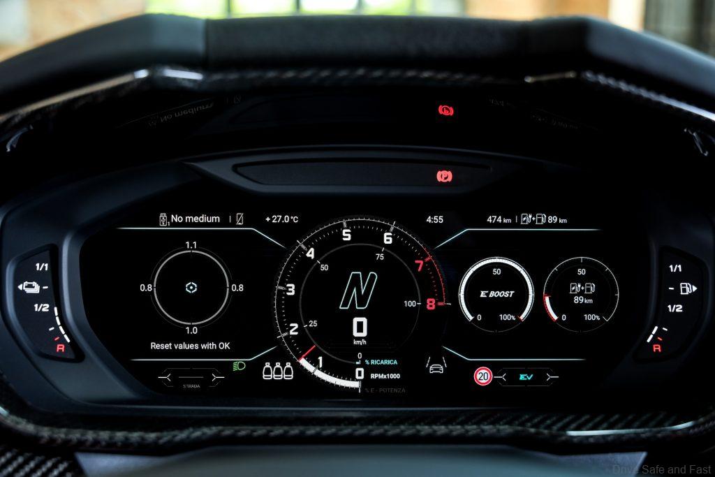 The “tamburo” selector offers six driving modes (Strada, Sport, Corsa, Neve, Sabbia, Terra) combined with four Electric Performance Strategies (EV Drive, Hybrid, Performance, Recharge), providing 11 distinct driving experiences.