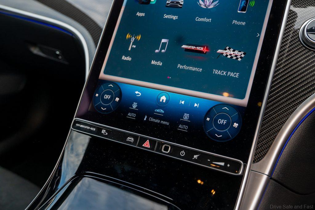 The MBUX infotainment system features a 12.3-inch driver display and 11.9-inch central display, offering AMG-specific functions and displays. AMG TRACK PACE, a data logger for track use, is integrated into the system.