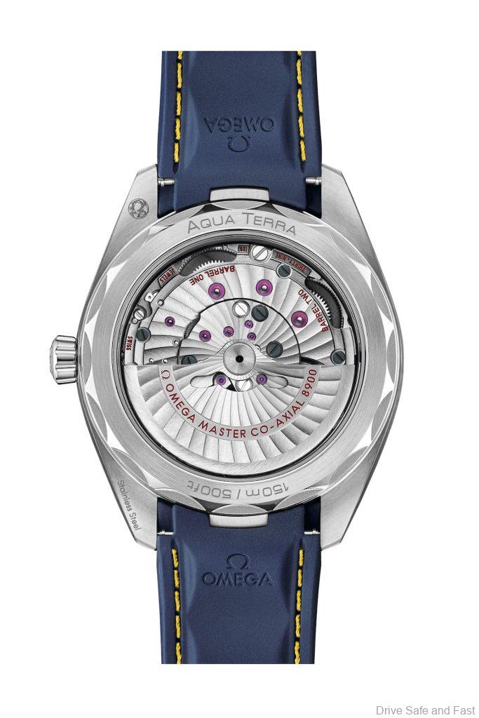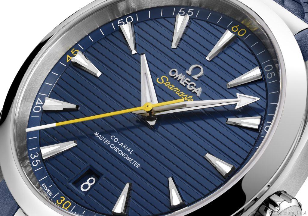 The 41mm stainless steel case of the Seamaster Aqua Terra “Mondo” Duplantis is complemented by an integrated blue rubber strap with yellow stitching – a nod to the colors of the Swedish flag. The polished and brushed surfaces of the case blend seamlessly with the polished central links of the strap, creating a cohesive and sophisticated look.