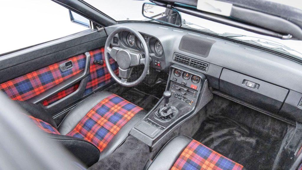 However, the classic Porsche approach with a roll-over bar was also pursued. The transaxle Targa prototype was based on a 924 Turbo from the 1979 model year in glistening Alpine white with strongly contrasting tartan centre panels on the seats.