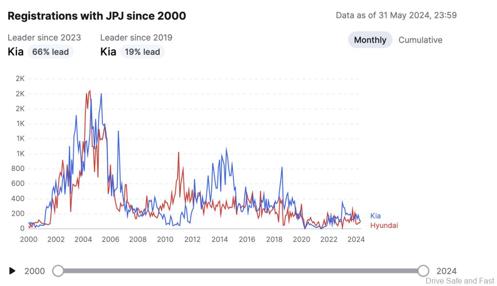 Korean brands have gone from 2,000 cars a month to 1,000 cars a month and now have fallen to 400 cars a month at best. The biggest drop comes in around 2018 when the Geely-based Proton X70 entered the market.