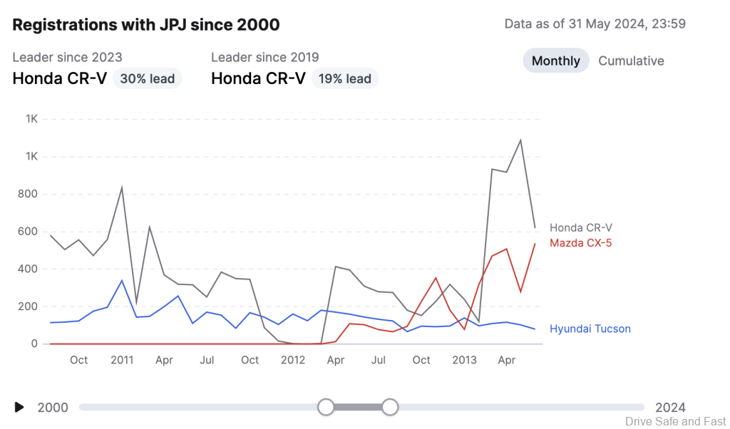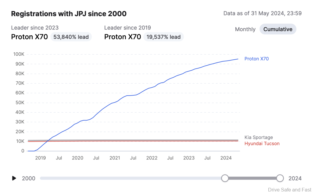 Zooming in to the introduction of the Chinese-engineered X70 to the Malaysian market, we can see how it has fared against its competitors from Korea, the Hyundai Tucson and Kia Sportage. Both Korean C-segment SUVs have stagnated in sales at around the 10,000 cumulative units mark in the last 5+ years.