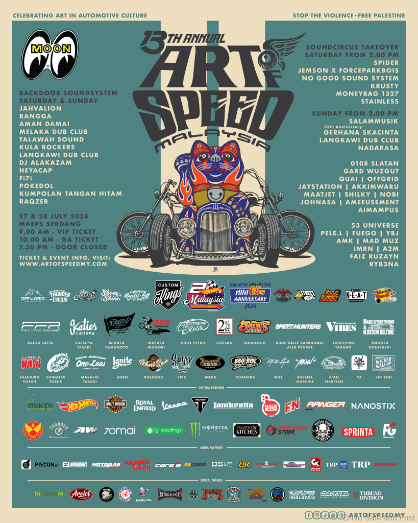 With weekend passes priced at an affordable RM35 (excluding processing fees) and free entry for children under 12 and OKU pass holders, Art of Speed 2024 is set to be an unmissable event for automotive enthusiasts and families alike. Whether you’re into custom bikes, hot rods, streetwear, or just looking for a fun weekend out, AOS 2024 promises something for everyone. Mark your calendars for July 27-28 and get ready to experience the best of Malaysia’s kustom and counter-culture scene at MAEPS Serdang.