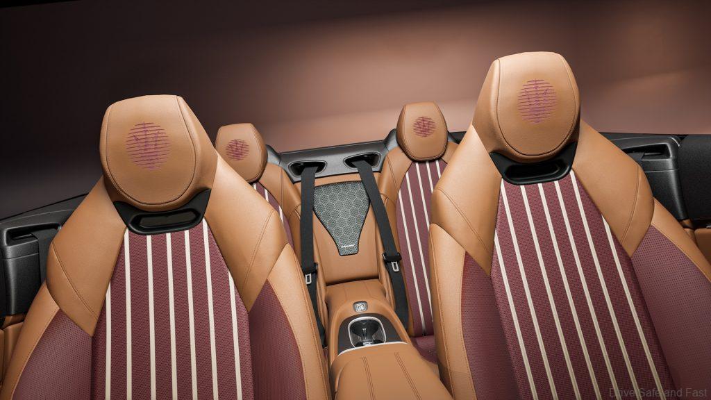 Inside, the GranCabrio Folgore Tignanello truly shines. The seats feature an innovative material called Vegea, derived from vineyard by-products, in a pattern reminiscent of vineyard rows. Dark briar wood panels with laser-etched details about Tignanello’s history adorn the interior, while subtle nods to both brands appear on the headrests and center console.
