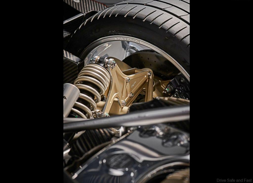 Powering the Pagani Utopia Roadster is an AMG-sourced hand-assembled V12 with 864 horsepower and 1100Nm of torque available. This engine is twin turbocharged but has no hybrid system. An Xtrac-sourced 7-seed manual gearbox is positioned transversely behind the engine with an adjustable triple disc clutch. An AMT automated gearbox is also available for those who prefer to shift via paddles.