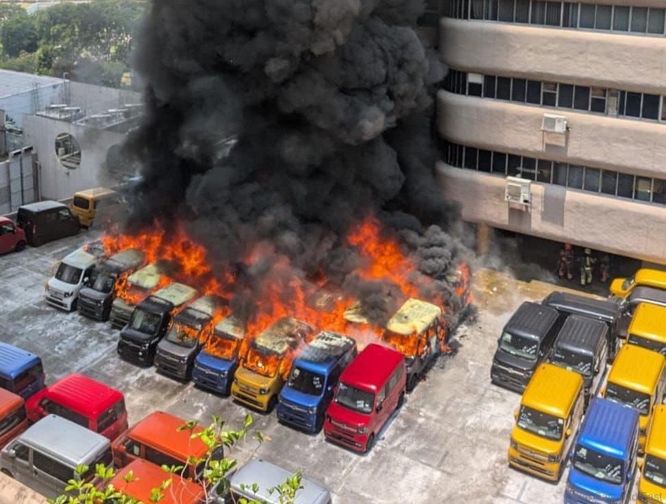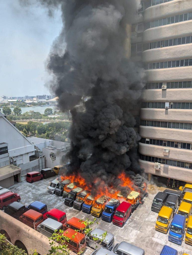 The photo shared here of the incident shows a column of thick, black smoke and more than a dozen Honda N-Box vehicles on the roof of a multi-storey carpark engulfed in flames. At least nine SCDF vehicles were seen around Golden Mile Tower at 2.30pm.