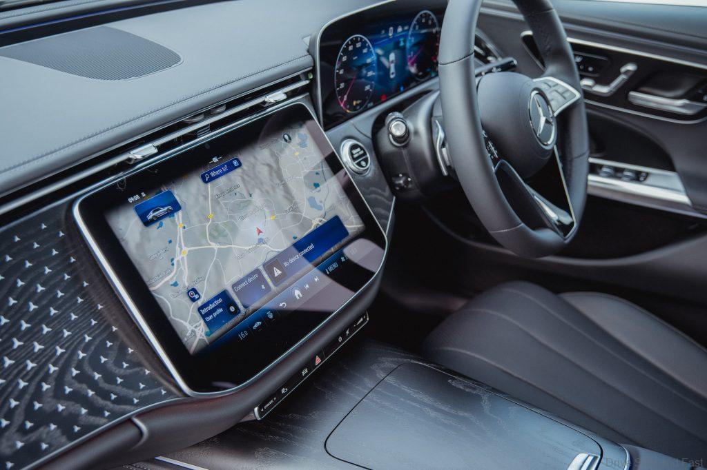 Inside, you’ll find a 12.3″ driver display and a 14.4″ central display. There’s a Driver Monitoring Camera, wireless charging pad in front, a 5G module for Mercedes me connected services, MBUX augmented reality for navigation, Parktronic and a 360-degree camera, as well as Apple CarPlay and Android Auto. The standard sound system on the E200 feautres a 125 watt, 5 channel amplifier and 7 speakers.