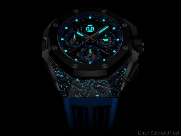 - A 43 mm case with a CFT carbon middle, adorned with luminescent blue fibers