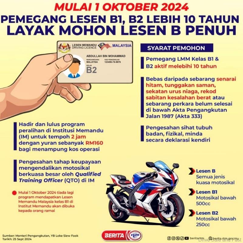 Good news for Malaysians who have had their B1 and B2 licenses for over a decade. Starting 1 October 2024, individuals holding B1 and B2 motorcycle licenses for over ten years will be eligible to apply for a full B motorcycle license in Malaysia. This new policy marks a significant transition for long-term license holders who wish to expand their riding capabilities.