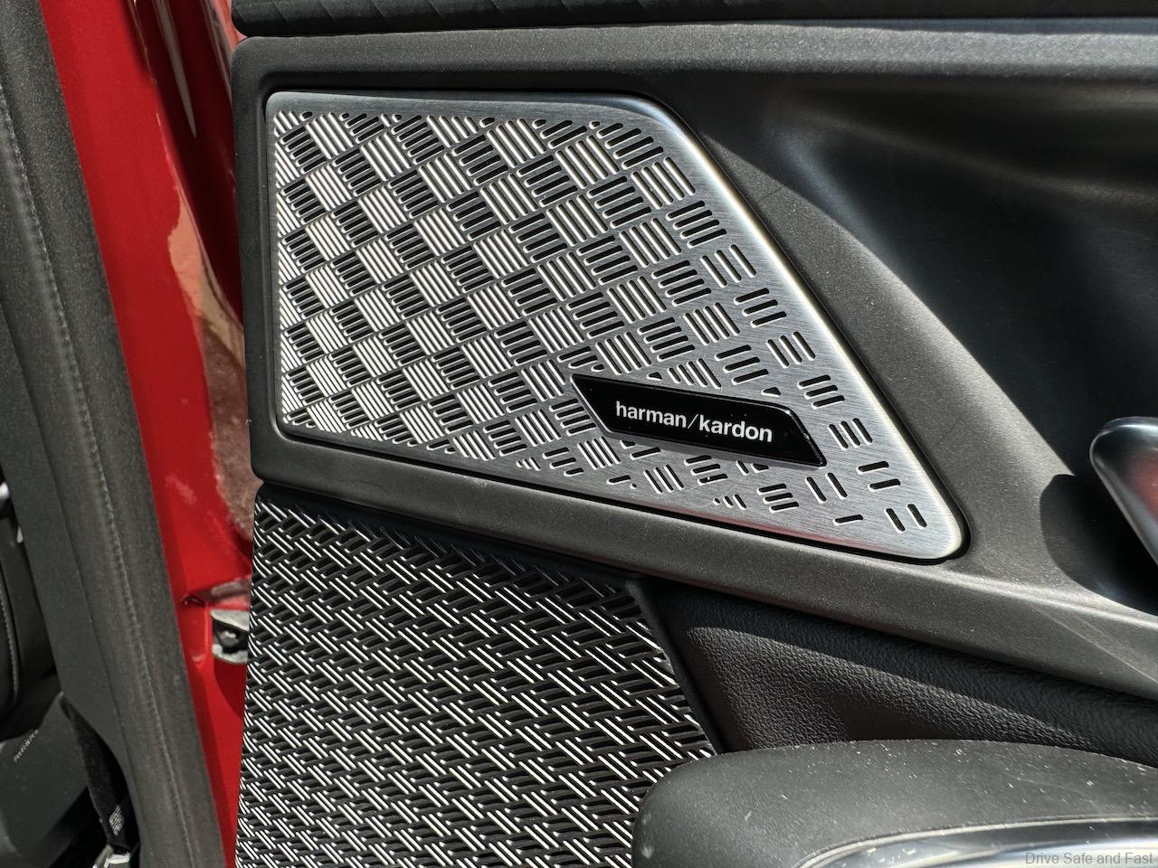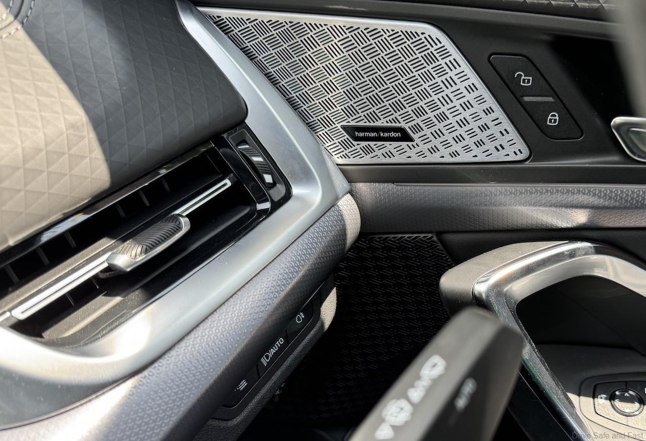 There’s also a 10.25″ digital instrument cluster and a full-colour heads-up display. Other features include a ventilated wireless smartphone charging tray, a powered tailgate, a premium Harman Kardon sound system and ‘M’ multifunction leather steering wheel. The interior is finished with aluminium hexacube pale ‘M’ interior trim pieces and fine grain Veganza faux leather with contrast stitching.