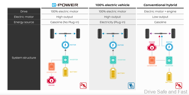 This is e-POWER technology from Nissan Japan and it takes away driving range anxiety, the need to use an app to book a battery charger and the worry that a long wait is needed while the battery gets charged. e-POWER vehicles are essentially electric cars (EV) with an onboard petrol fed generator for battery self-charging.