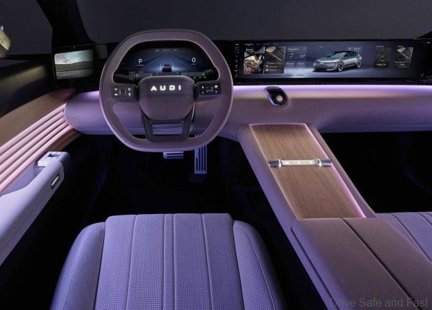 One of the most striking features of the AUDI E is its lighting design, incorporating clusters of triangles under the hood that create a mesmerizing lighting effect, complemented by similar patterns at the rear. This distinct approach sets the AUDI brand’s visual style, ensuring that it stands out from the crowd of EVs on Chinese roads. Inside, the car offers a spacious and digitally connected environment, centered around a continuous pillar-to-pillar display that merges digital mirrors and infotainment seamlessly. The interior design emphasizes comfort with home-like features, including ambient lighting and natural wood materials, creating an inviting, contemporary atmosphere.