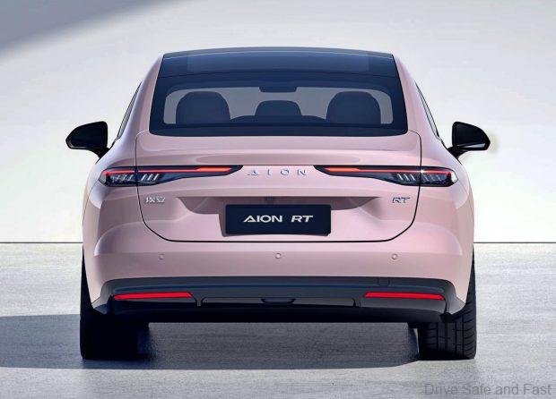 The AION RT is an electric sedan designed with aerodynamic efficiency elements. Its exterior design incorporates a drag coefficient of 0.208 Cd, achieved a 28° forward lean and 20° rear slope. Exterior paint options include Moonlight White, Crystal Purple, Sea Glow Grey, and Sun Crown Red.