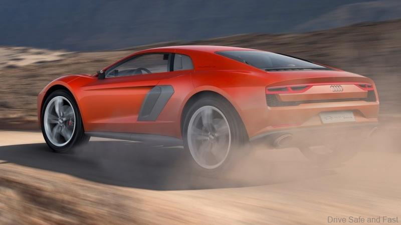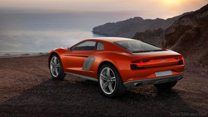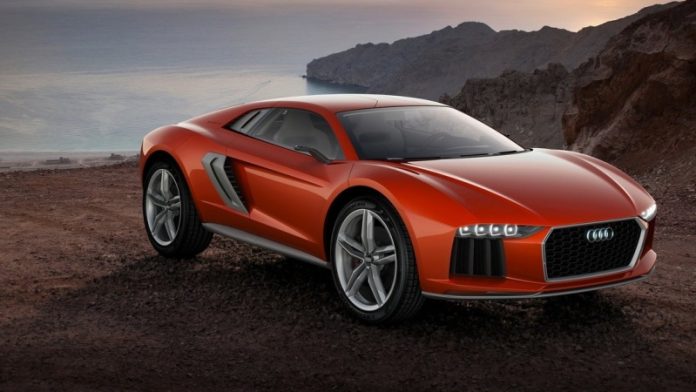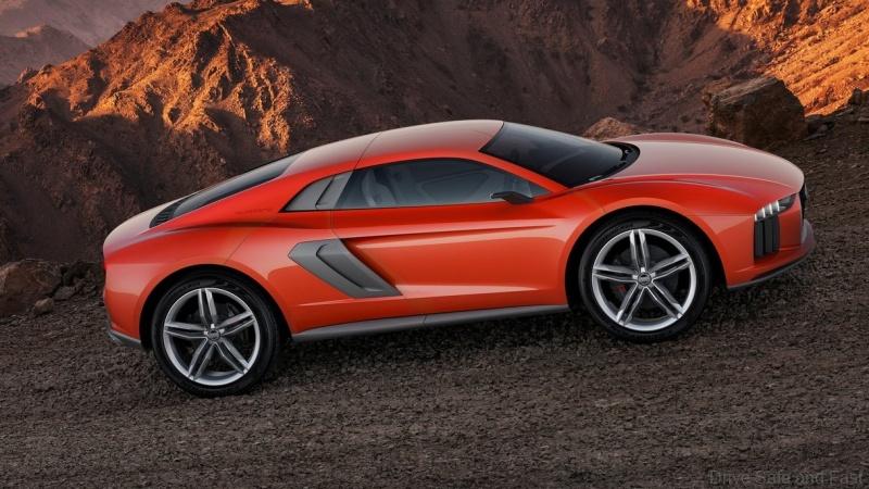 The vehicle features a lightweight aluminum Audi Space Frame (ASF) with carbon fiber reinforced polymer (CFRP) body panels, finished in Extreme Red. Its sharp, angular lines and large wheels create a striking presence, while the front end features a hexagonal single-frame grille and advanced Audi Matrix LED technology, which adapts between low and high beams for optimal visibility.