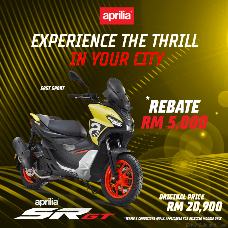 Moreover, campaign highlights include the Aprilia SR GT 200 with a selling price of RM19,900 and a cash rebate of RM6,000, the Aprilia SR GT 200 SPORT with a selling price of RM20,900 and a cash rebate of RM5,000 as well as the Aprilia SR GT 200 REPLICA with a selling price of RM20,900 and a cash rebate of RM2,000