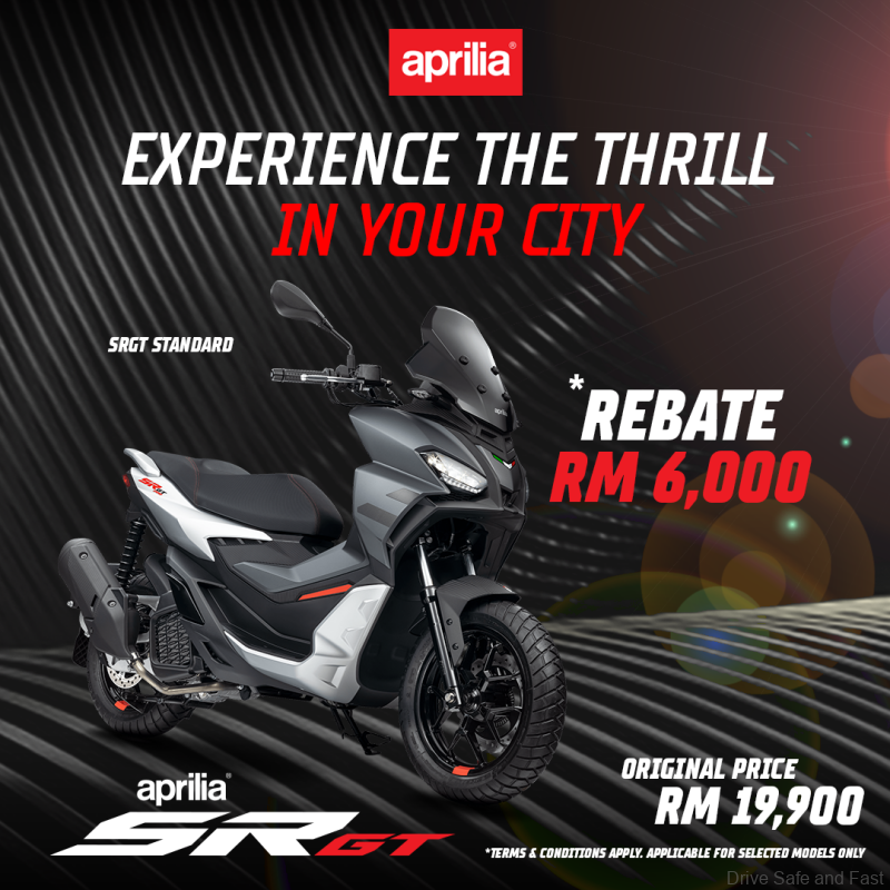 Moreover, campaign highlights include the Aprilia SR GT 200 with a selling price of RM19,900 and a cash rebate of RM6,000, the Aprilia SR GT 200 SPORT with a selling price of RM20,900 and a cash rebate of RM5,000 as well as the Aprilia SR GT 200 REPLICA with a selling price of RM20,900 and a cash rebate of RM2,000