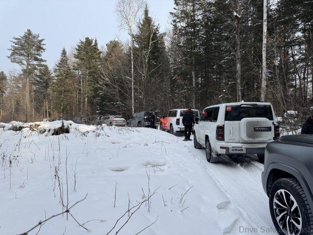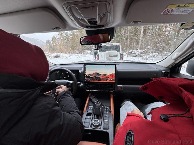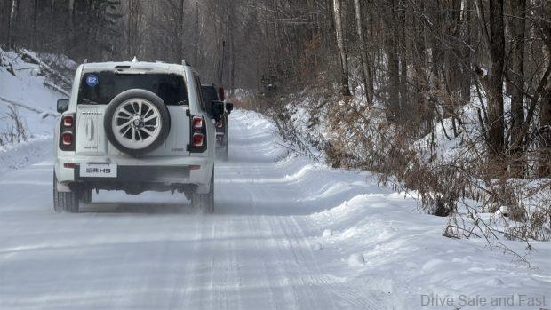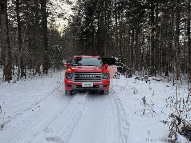 This is why it delivers a stable ride. The H9’s steering response in the slippery conditions is mostly predictable and only on thick ICE does it ‘run away’ from you. The BorgWarner four-wheel drive system and front and rear differential locks provide strong traction along our slippery journey. Despite its size, this SUV’s cornering function offers an impressive maneuvering edge in tight spots along our slippery forest trail.
