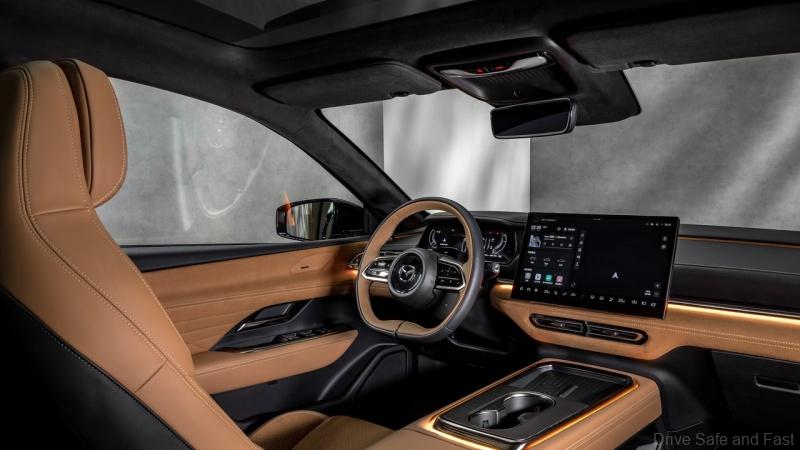 The Mazda 6e’s interior offers a premium and spacious environment, inspired by the Japanese design concept of ‘Ma,’ which celebrates the beauty of empty space. A panoramic lights up the cabin while the driver-focused cockpit features a 14.6-inch touchscreen, a 10.2-inch instrument cluster and an augmented reality head-up display.