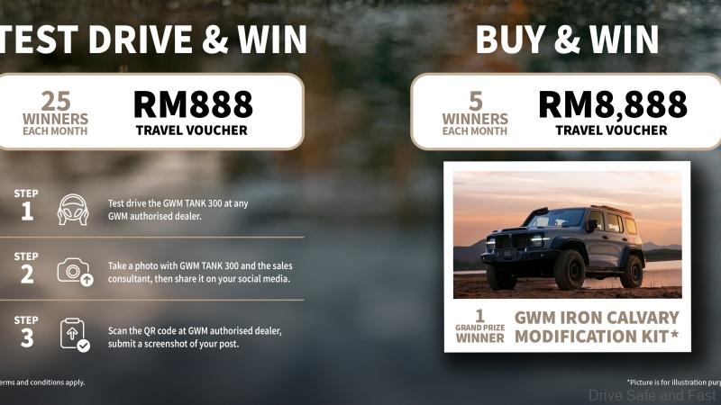 On top of that, GWM Malaysia is launching four exciting promotions to further enhance the ownership experience for new and prospective TANK 300 owners including a test drive and win competition where customers take the TANK 300 for a test drive and stand a chance to win a travel voucher worth RM888.