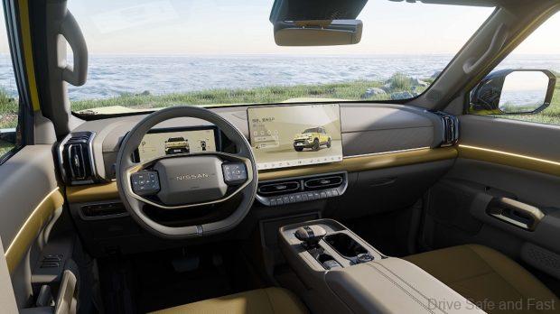 The Frontier Pro’s exterior styling centers around a “Rugged Tech” concept, featuring a modern design aesthetic that complements its spacious and refined interior. A standout feature is the illuminated Nissan logo on the front mask, glowing in vibrant white to signify the truck’s new era of electrified capability.