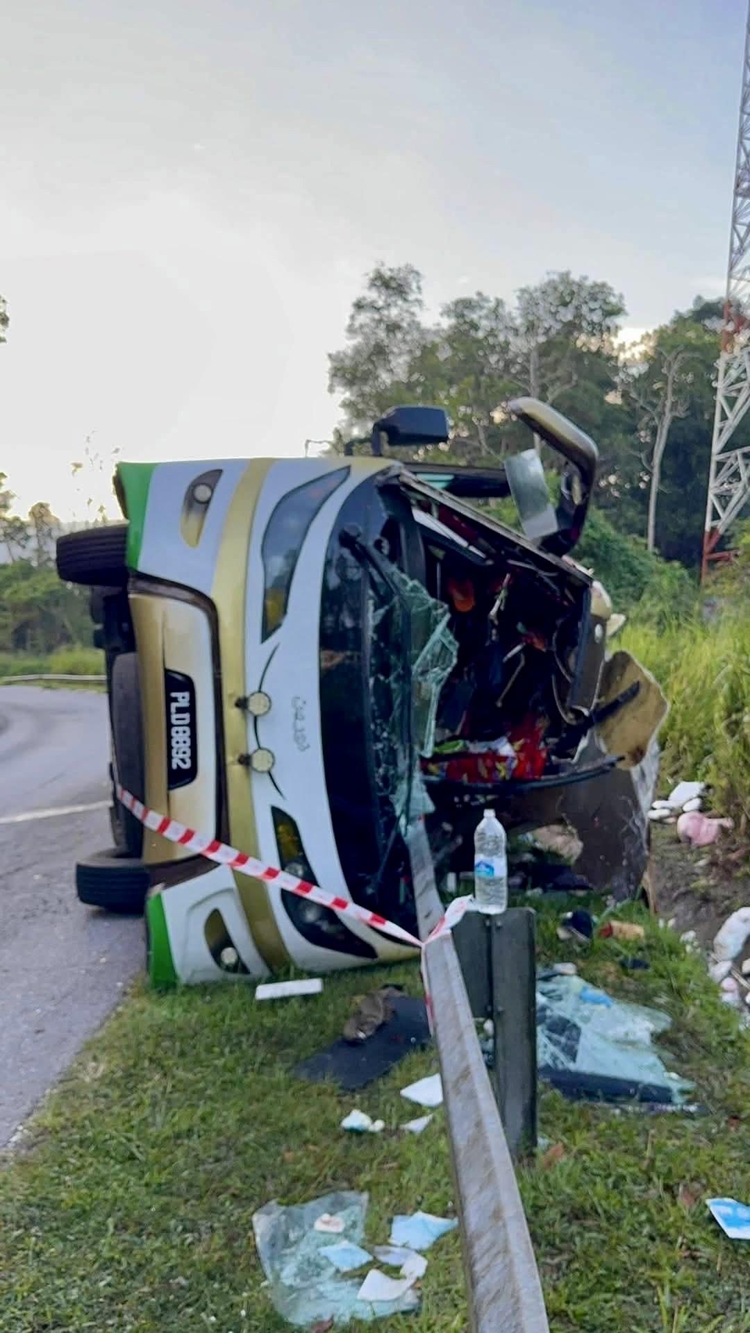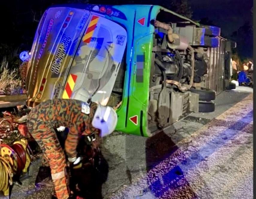 Moreover, they found the bus overturned, the aftermath of a violent crash with the Perodua Alza. Initial reports indicate that the bus was transporting a group of students from UPSI when the collision occurred.