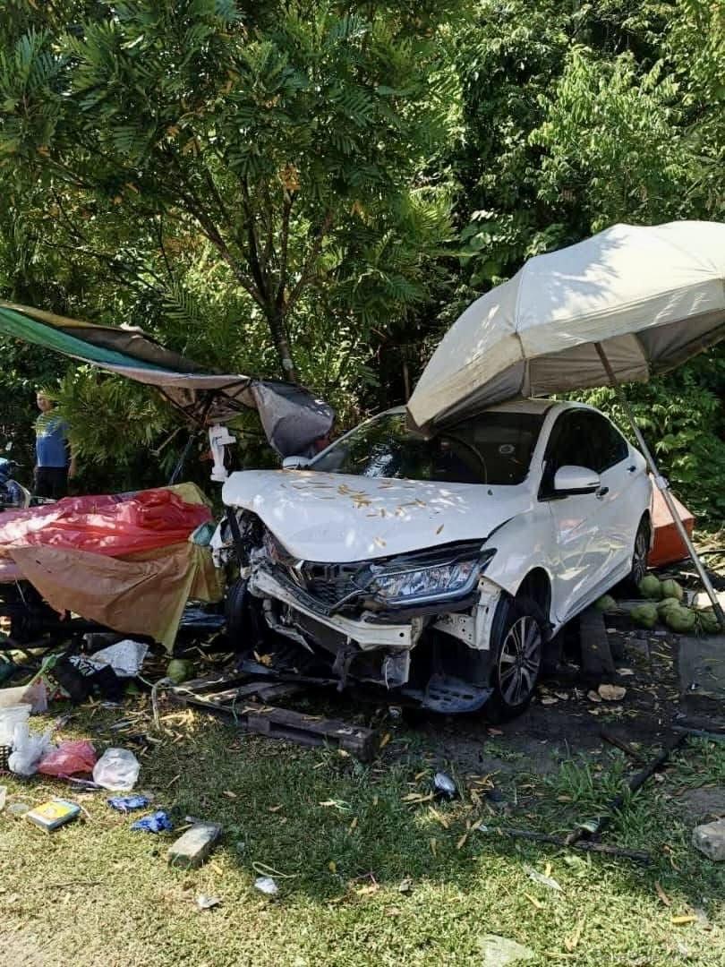 A coconut water vendor and two elderly individuals sustained injuries following a road accident near the Kuala Kangsar District Police Quarters earlier today. The incident occurred at approximately 11:30 a.m. when a car driven by an elderly couple crashed into the vendor’s roadside stall.