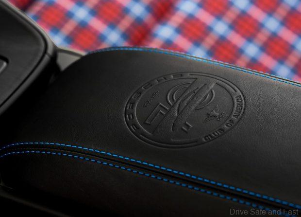Inside, there’s a “Porsche Club of America” door sill insert and door projectors with the PCA 70 year logo. The interior is upholstered in black leather with stitching and matching seat belts in Speed Blue and Guards Red.