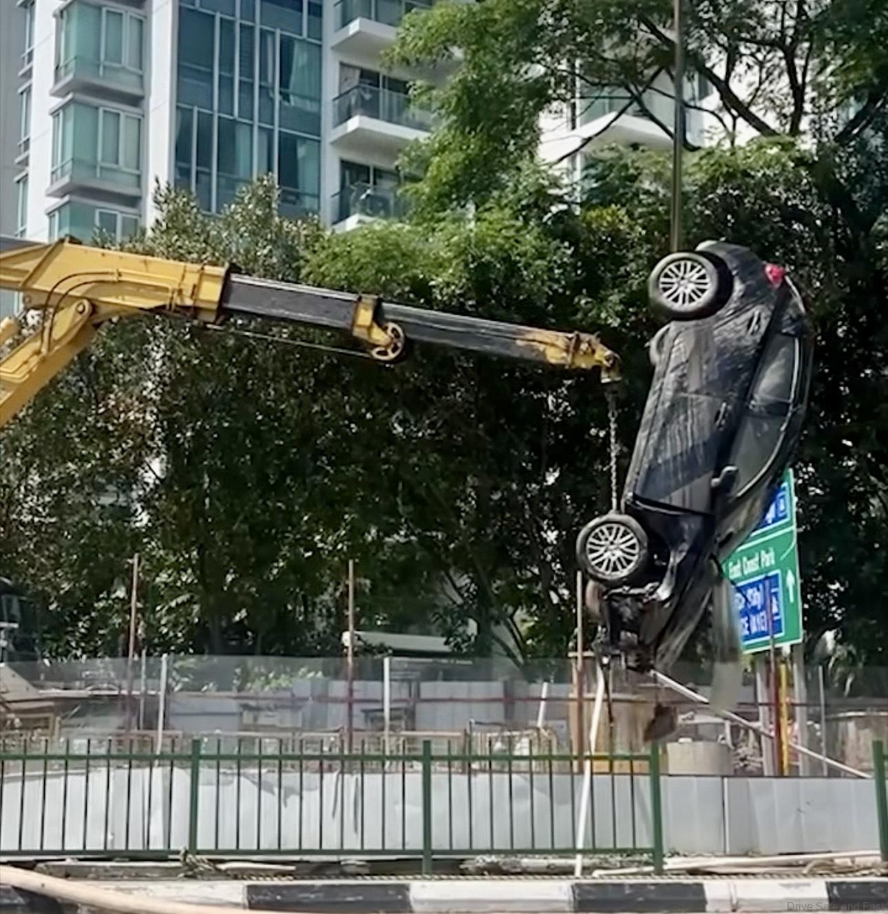 Now the car that fell into a sinkhole along Tanjong Katong Road South was lifted out on Sunday (Jul 27 one day later) afternoon.
