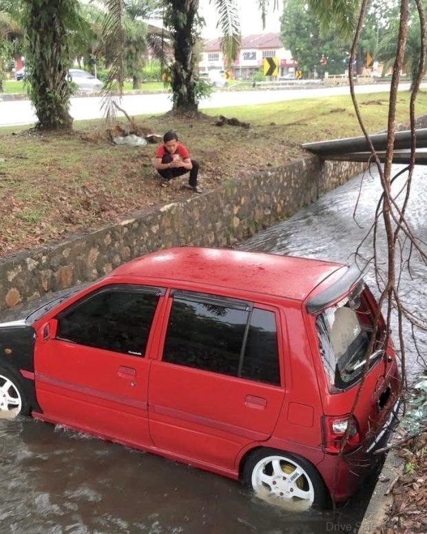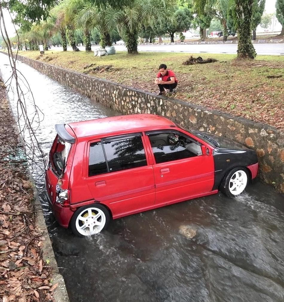 A Perodua vehicle ending up in a monsoon drain is not really uncommon occurrence these days, particularly during heavy rain and flooding. Several incidents have been reported where Perodua cars, especially the Myvi model, have skidded or been swept away into monsoon drains. However, this time we see its younger sibling, the Kancil in the monsoon drain.
