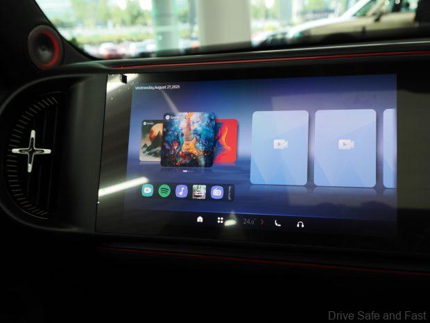Upfront, the dual 13″ OLED screens are extremely sharp and fluidly animated. There are some baked on capacitive buttons on the side for vehicle settings, some climate control shortcuts and Driving Mode access.