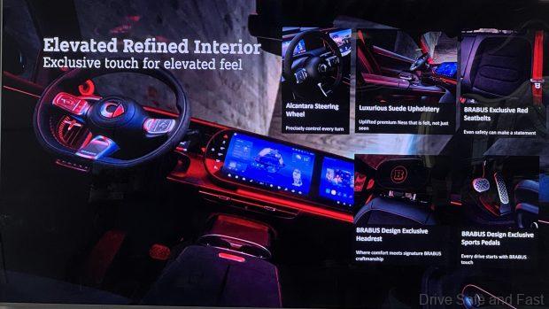 Visually, the bumpers, side sills, rims and spoiler are unique on the BRABUS model. Inside, you get an Alcantara steering wheel, BRABUS red seatbelts, metal sports pedals, and BRABUS logos embroidered into the headrests. The black on red interior also features its own unique patterns versus the PREMIUM spec. You lose the wood trim for metal inserts.