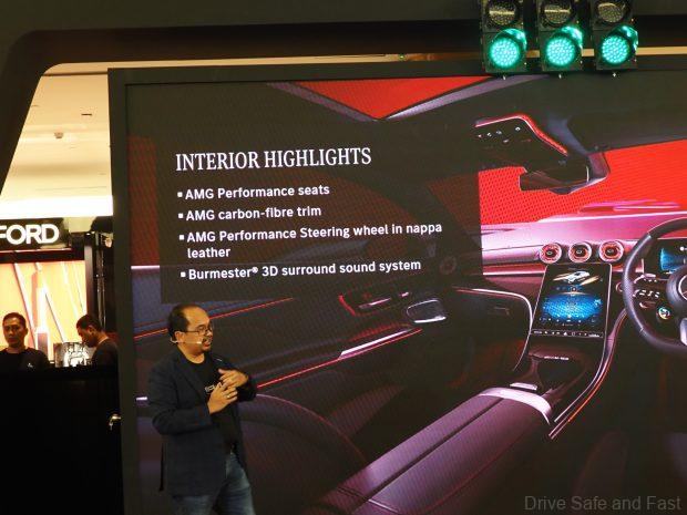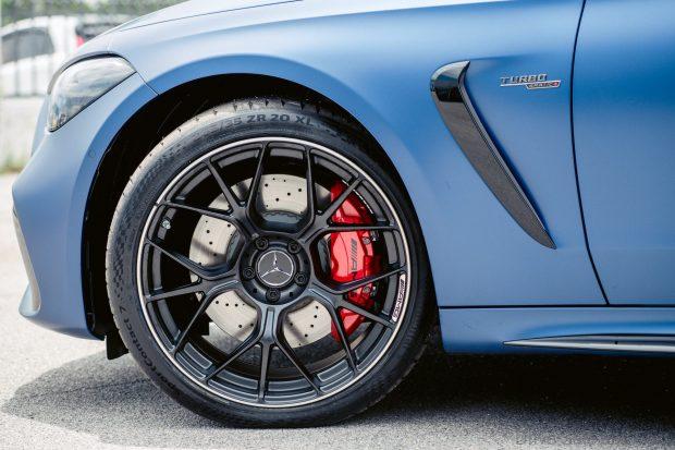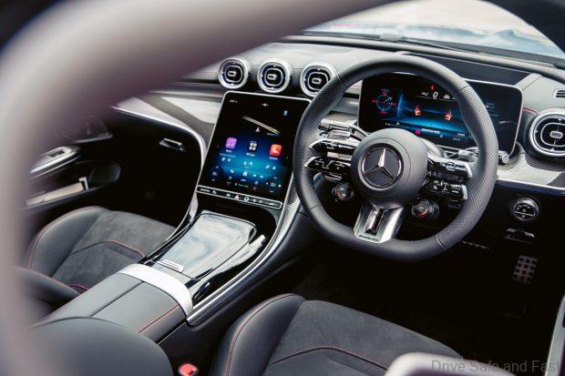 Inside, the cabin blends luxury and performance with AMG Performance seats, carbon-fibre trim, red seat belts, and a driver-focused cockpit. The dual-display setup includes a 12.3-inch digital driver display and 11.9-inch central display, complemented by AMG TRACK PACE, head-up display, and a Burmester® 3D surround system.