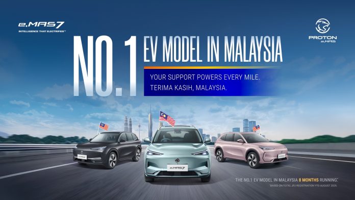 Proton New Energy Technology Sdn Bhd (PRO-NET) has announced that the Proton e.MAS 7 remains Malaysia’s best-selling electric vehicle (EV), leading the market for eight consecutive months since the beginning of 2025.
